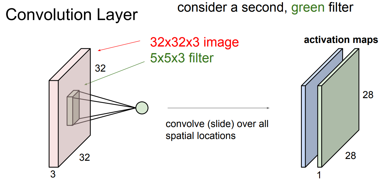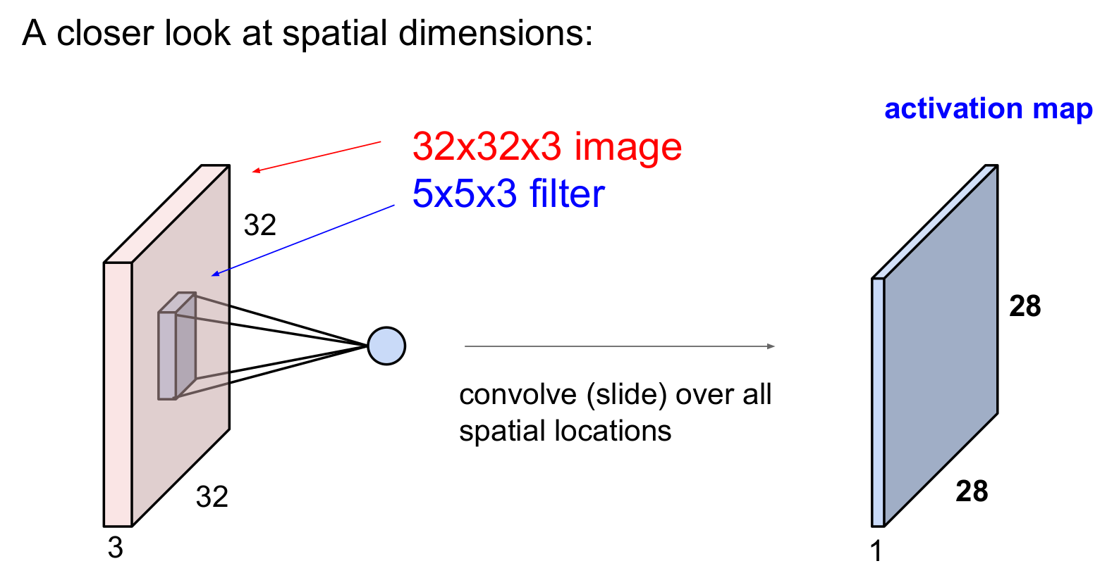 앞에서 Layer를 필터로 훑는다고 했습니다. 1개의 필터로 이러한 과정을 거치면 1채널의 activation map 1개를 얻게 됩니다. 이 과정은 다음과 같습니다.