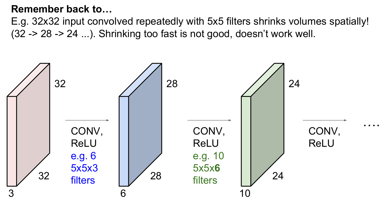 일반적인 구조는 C[(CONV-RELU)*N-POOL?]*M-(FC-RELU)*K,SOFTMAX이며