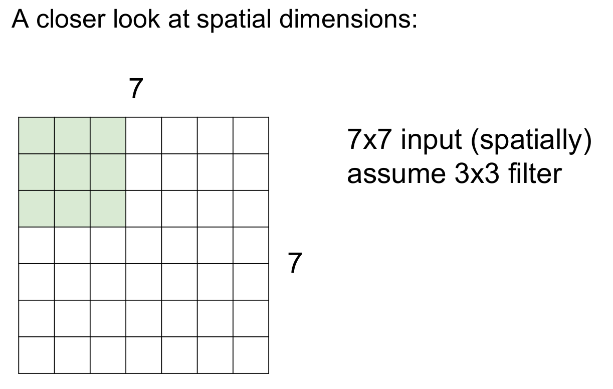 연산의 결과는 어떻게 나타날까요? 쉽게 알 수 있게 7*7픽셀의 이미지를 3*3 필터로 훑어간다고 생각해 봅시다. 앞서 언급한 대로 좌상단부터 훑어갑니다. 직접 손으로 그려보면 쉽게 몇 번의 연산을 하는지 알 수 있습니다. 제가 해본 결과 4회 우로 이동하고 5회의 연산을 하는군요(시작 부분도 연산해야죠!). 7*7의 이미지니까 세로로도 같은 횟수의 연산을 하겠죠? 결과적으로 5*5의 출력물을 얻을 수 있습니다.