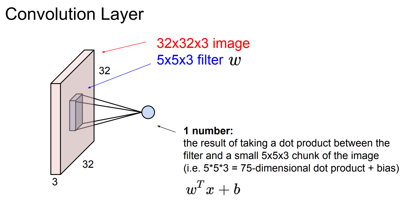 Conv는 구조부터 차이가 있습니다. 그림 2와 같이 원본 그대로의 형태를 유지(공간의 구조에 대한 정보를 유지하는 것입니다!)하면서, filter를 사용해서 레이어를 훑습니다(표현이 이상하지만 뒤에 설명을 보시면 '훑는다'는 표현이 이해되실겁니다). 한 연산의 과정을 거치면 하나의 숫자를 얻는데, 이는 필터의 dimensional dot product의 크기 * 채널수 + 분산의 결과입니다(위의 예에서 5 * 5 * 3 + 1).