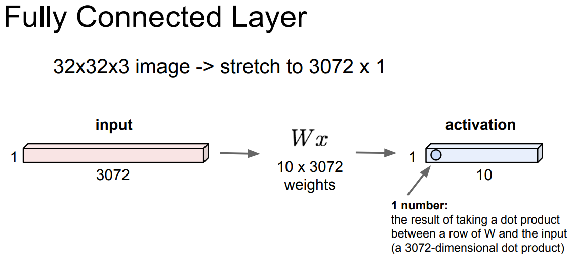 FC의 출력값의 한 점(1 number, dot product)은 입력 이미지의 전체 연산을 통한 한 클래스의 결괏값입니다. 반면 CL의 5중 필터를 거친 한 시점의 dot products(5 neurons)는 한 시점의 입력 이미지의 5가지 서로 다른 특징을 나타냅니다. 풀어쓰자면 FC의 한 점은 고양이로 예측하는 점수를 나타내는 것이라면, CONV의 한 시점은 입력 이미지의 특정 부분(고양이 귀)의 여러 특징(점, 선, 각도, 방향, 색 등)을 나타냅니다.