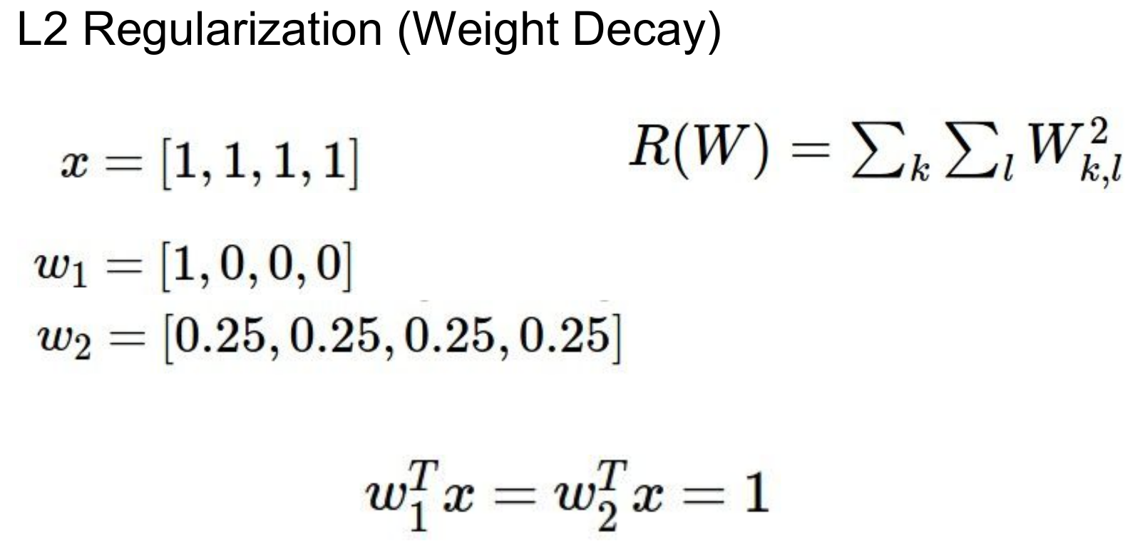 반면 L2 Regularization은 w2를 선호할 것입니다. w2가 norm이 더 작게 나타나기 때문입니다. L2 Regularization은 분류기의 복잡도의 기준을 더 coarse(지저분) 한 것으로 둡니다. 값이 매끄러운(편차가 적은) W를 선호하는 것이죠. 특정한 값이 라벨을 결정하는 것이 아닌 x의 모든 요소가 영향을 주는 것을 선호합니다.