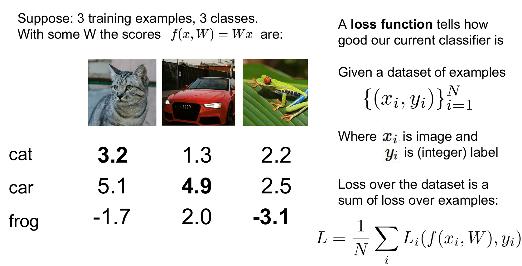 손실 함수 L_i는 예측 함수 f와 정답 값 Y를 입력으로 받아서 이 트레이닝 샘플을 얼마나 '구리게' 예측하는지를 정량화시켜줍니다. 우리가 원하는 것은 전체 데이터셋, 그리고 전체 클래스를 일반화할 수 있는 Loss Function을 구하는 것이기 때문에 전체 트레이닝 셋을 N으로 나눠줍니다. 최종 Loss인 L은 우리 데이터셋에서 각 N개의 샘플들의 Loss평균이 됩니다.
