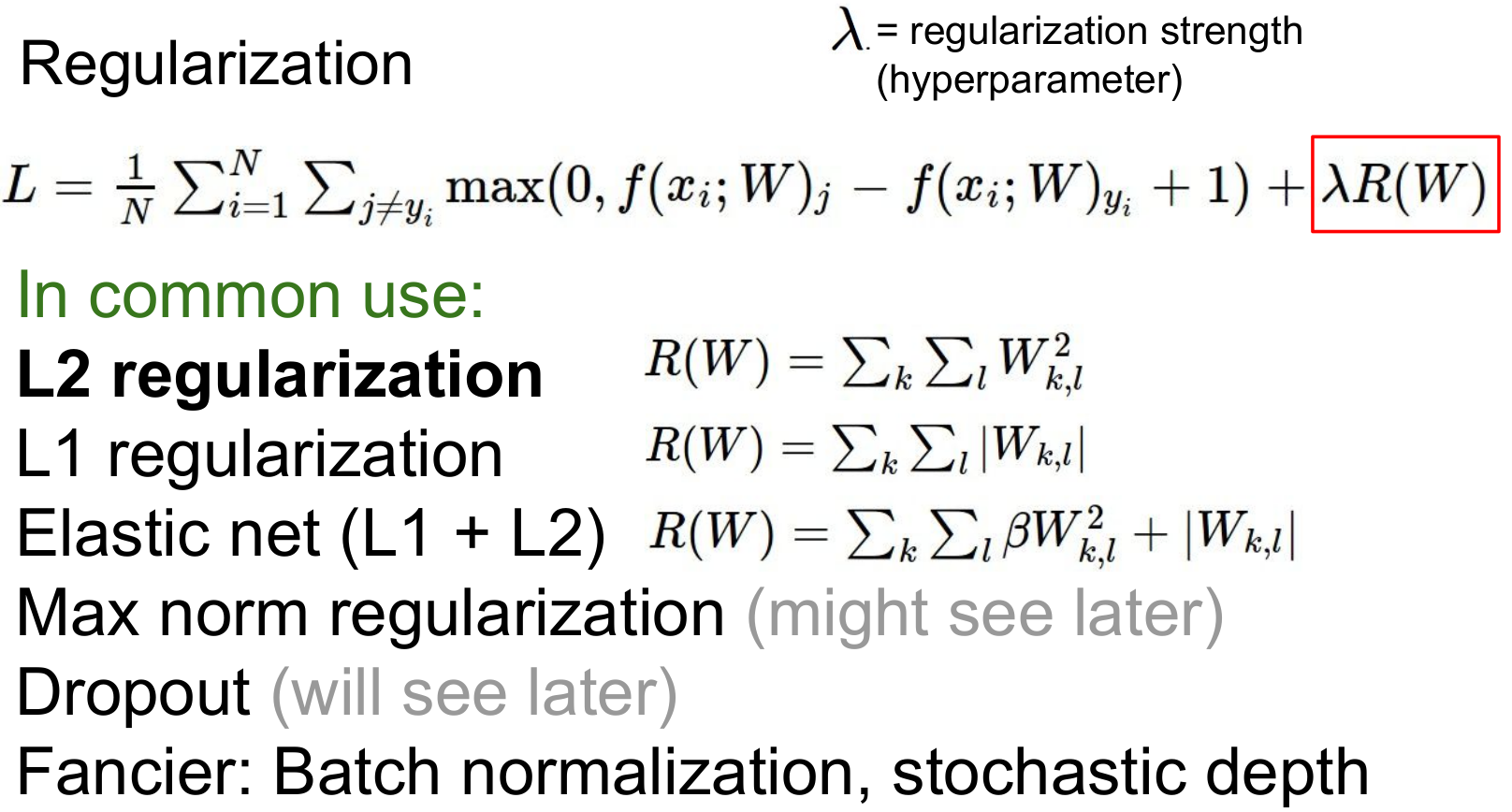 우리는 이 문제를 해결할 수 있는 방법을 Regularization이라고 합니다. 'Data Loss Term'에서는 분류기가 트레이닝 데이터에 핏하게 하고 여기에 손실 함수에 Regularization Term()을 추가하는데, 이것이 모델이 좀 더 단순한 모델(데이터나 모델에 따라 다름)을 선택하도록 도와줍니다. 일반적으로 비슷한 설명력을 갖는다면, 보다 단순한 모델을 설정해야 합니다. 이것이 보다 미래를 잘 예측할 수 있기 때문입니다.