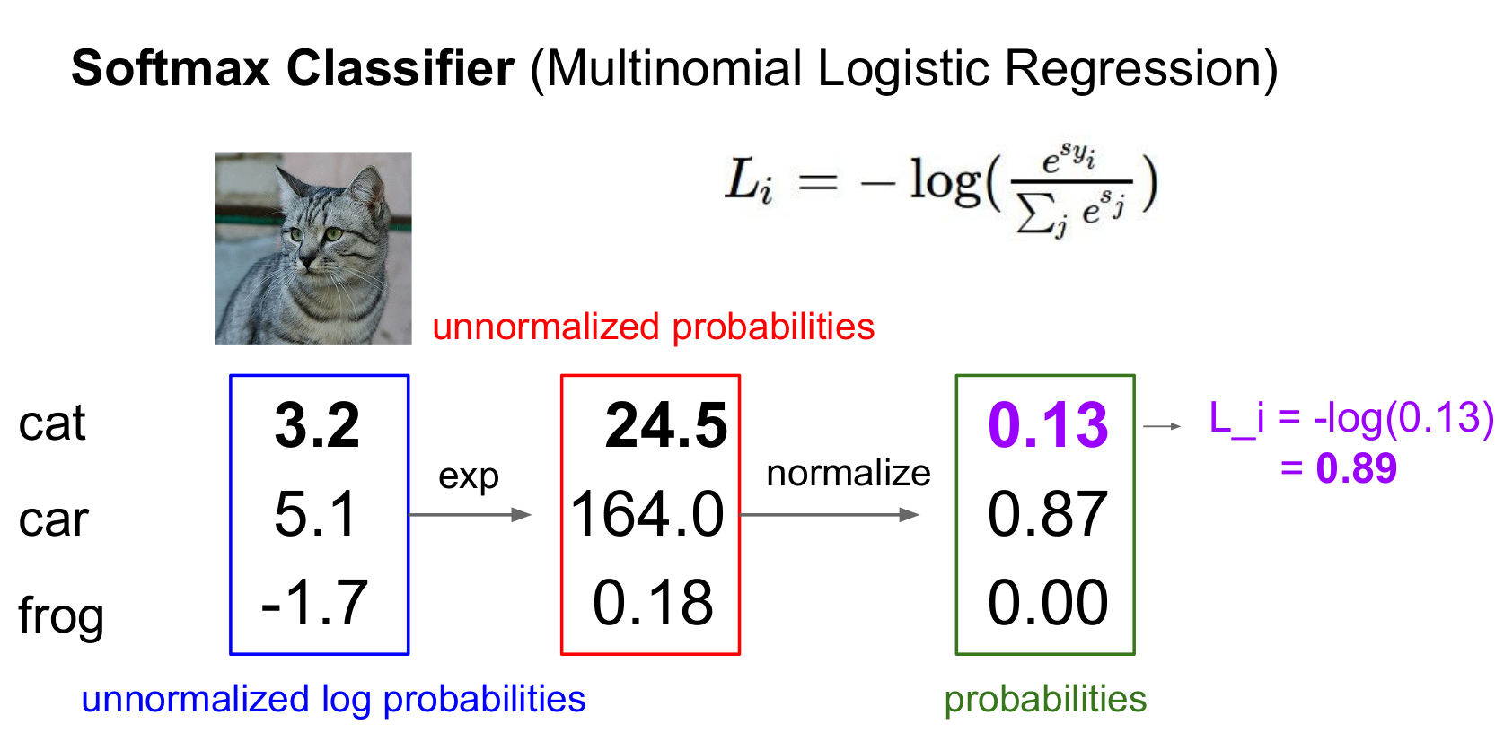 우리는 Linear Classifier를 활용해 Class별 score를 구했습니다. 이번엔 스코어 자체를 Loss로 쓰지 않습니다. 우선 이 score를 지수화(exponentiate)합니다. 그리고 합이 1이 되도록 정규화(normalize) 합니다. 그리고 도출된 정답클래스 스코어의 확률값에'만' -log를 씌워줍니다.