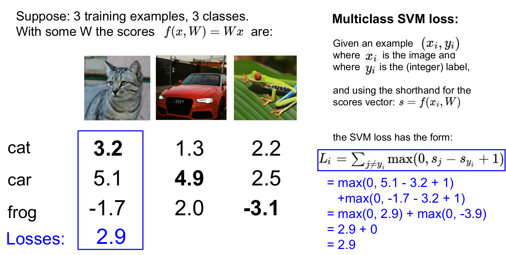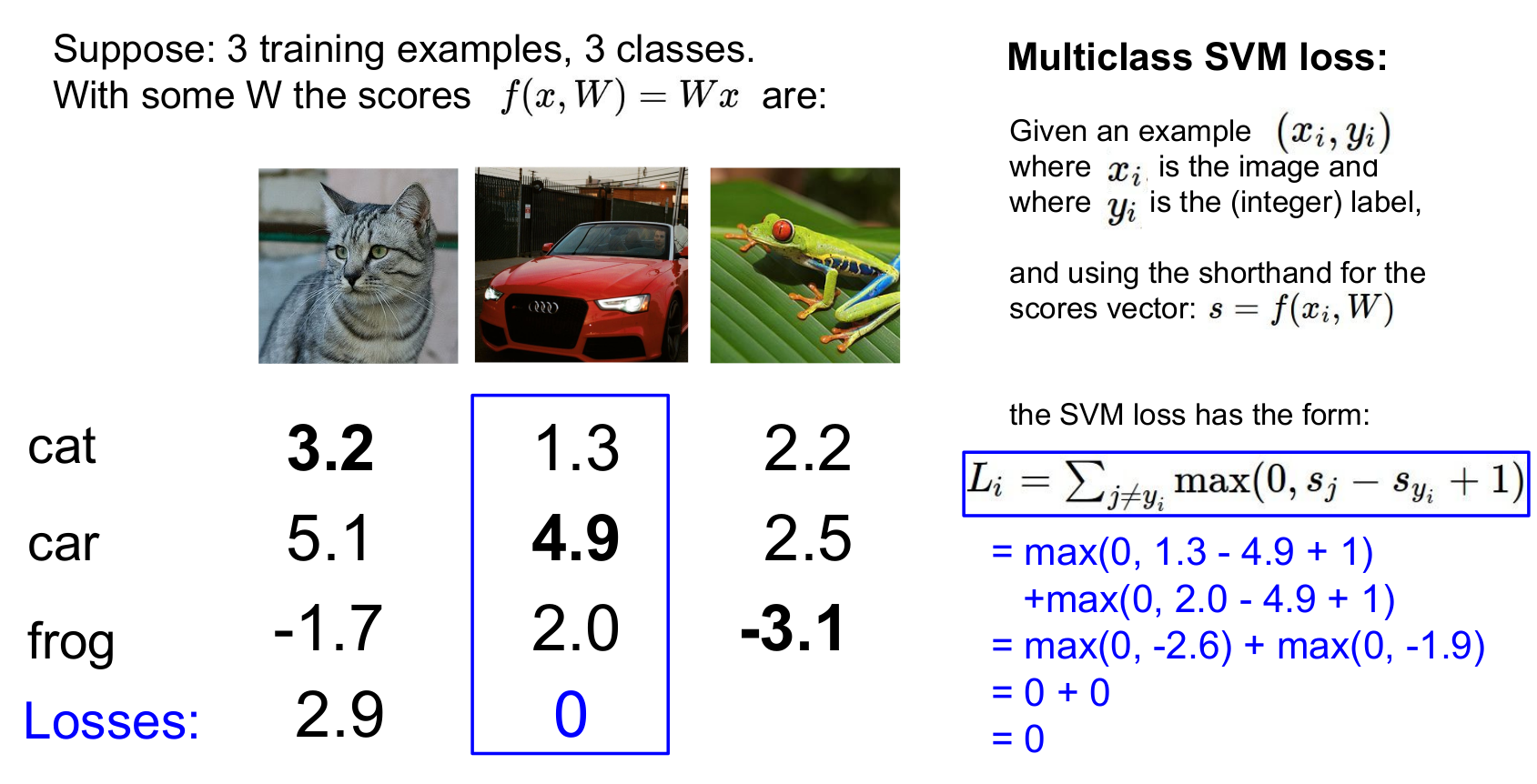 연습 삼아 자동차도 계산해 보겠습니다. car → cat의 loss값은 1.3 - 4.9 + 1 = - 2.6이며, car → frog의 loss값은 2.0 - 4.9 + 1 = - 1.9로 car의 최종 loss값은 0입니다. frog는 12.9의 loss값을 갖습니다.