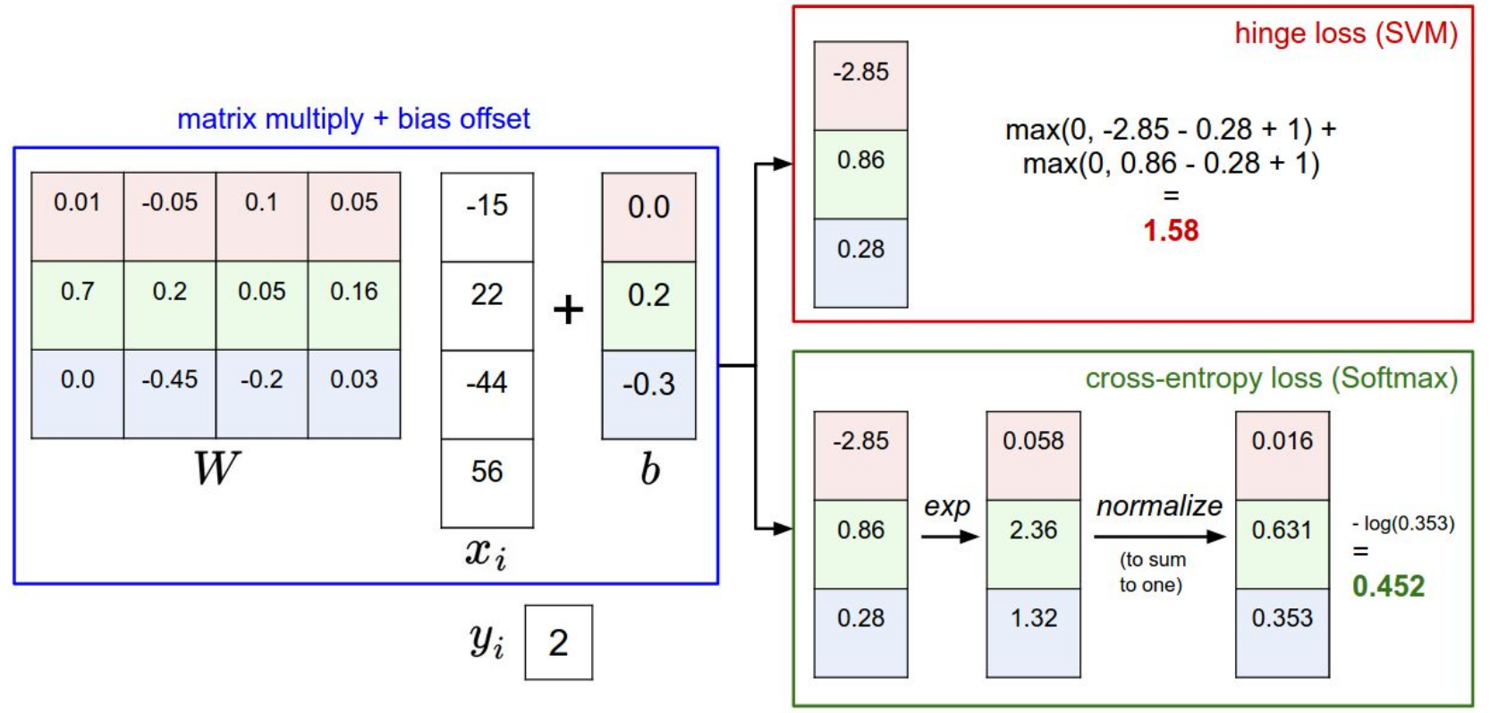 이후 각각의 loss function을 통해 loss값을 구하고, R(W)를 더해서 최종 loss값을 도출합니다. 여기서 둘의 차이점이 나타납니다. 우리가 설정한 가중치가 '얼마나 구린지'(이것보다 좋은 표현이...갓초월번역)를 측정하기 위해 loss score를 해석할 때, SVM은 정답 스코어와 정답이 아닌 스코어 간의 margin을 신경 썼습니다. 반면 Softmax는 확률을 구해서 -log(P(정답 클래스))를 신경 씁니다.